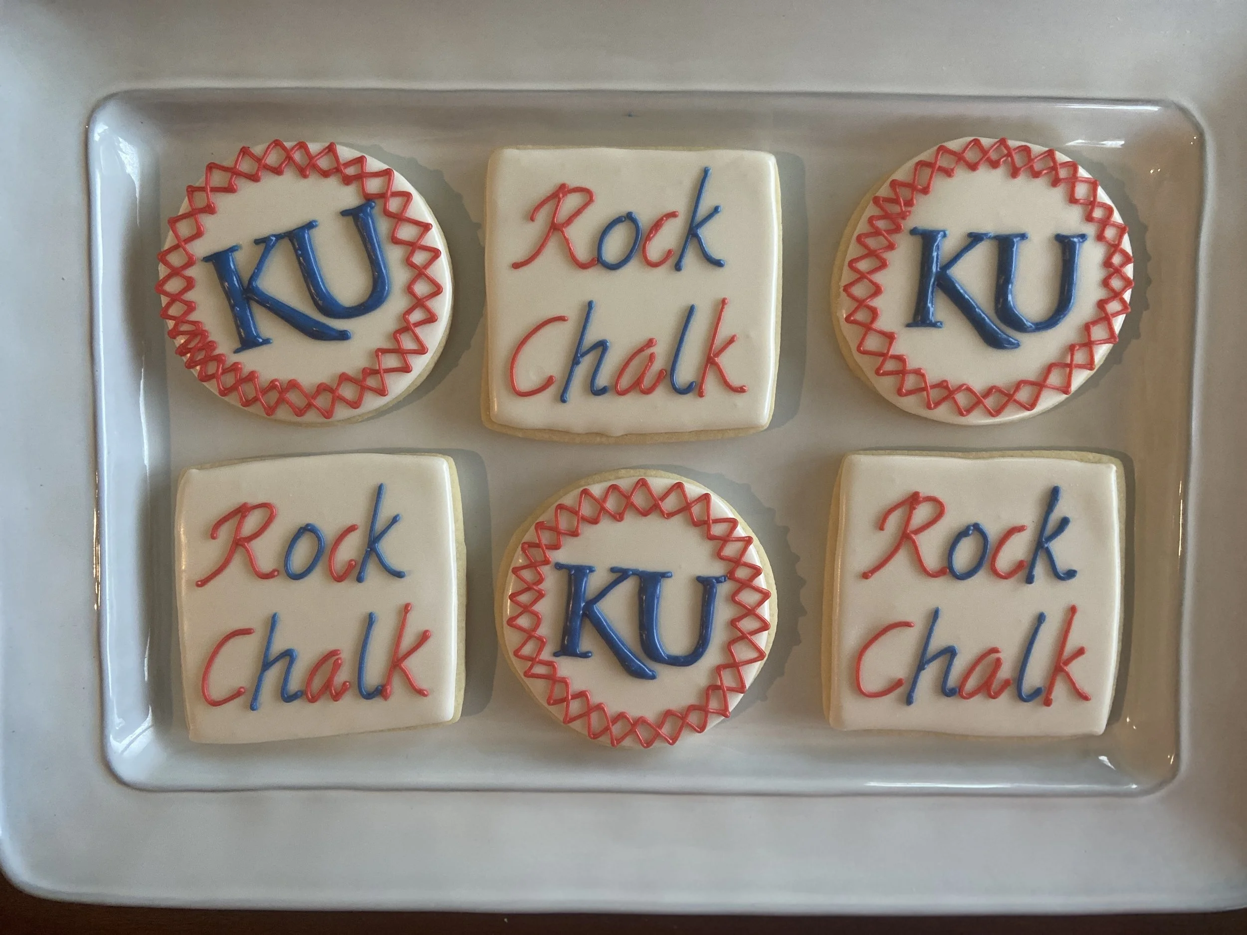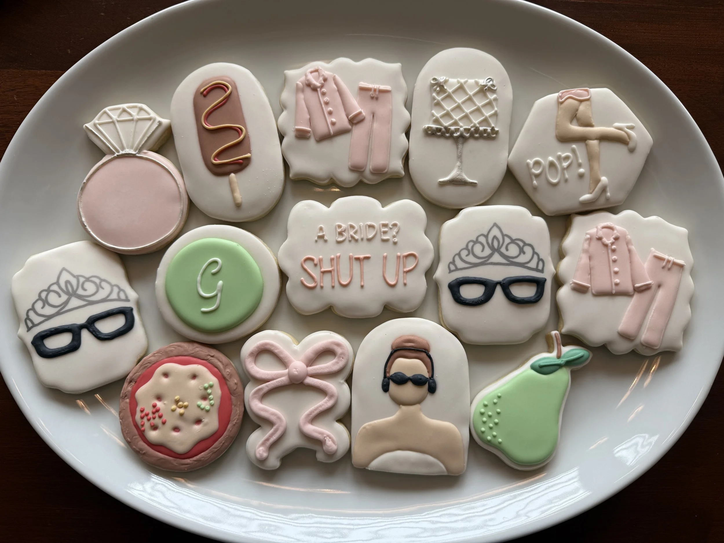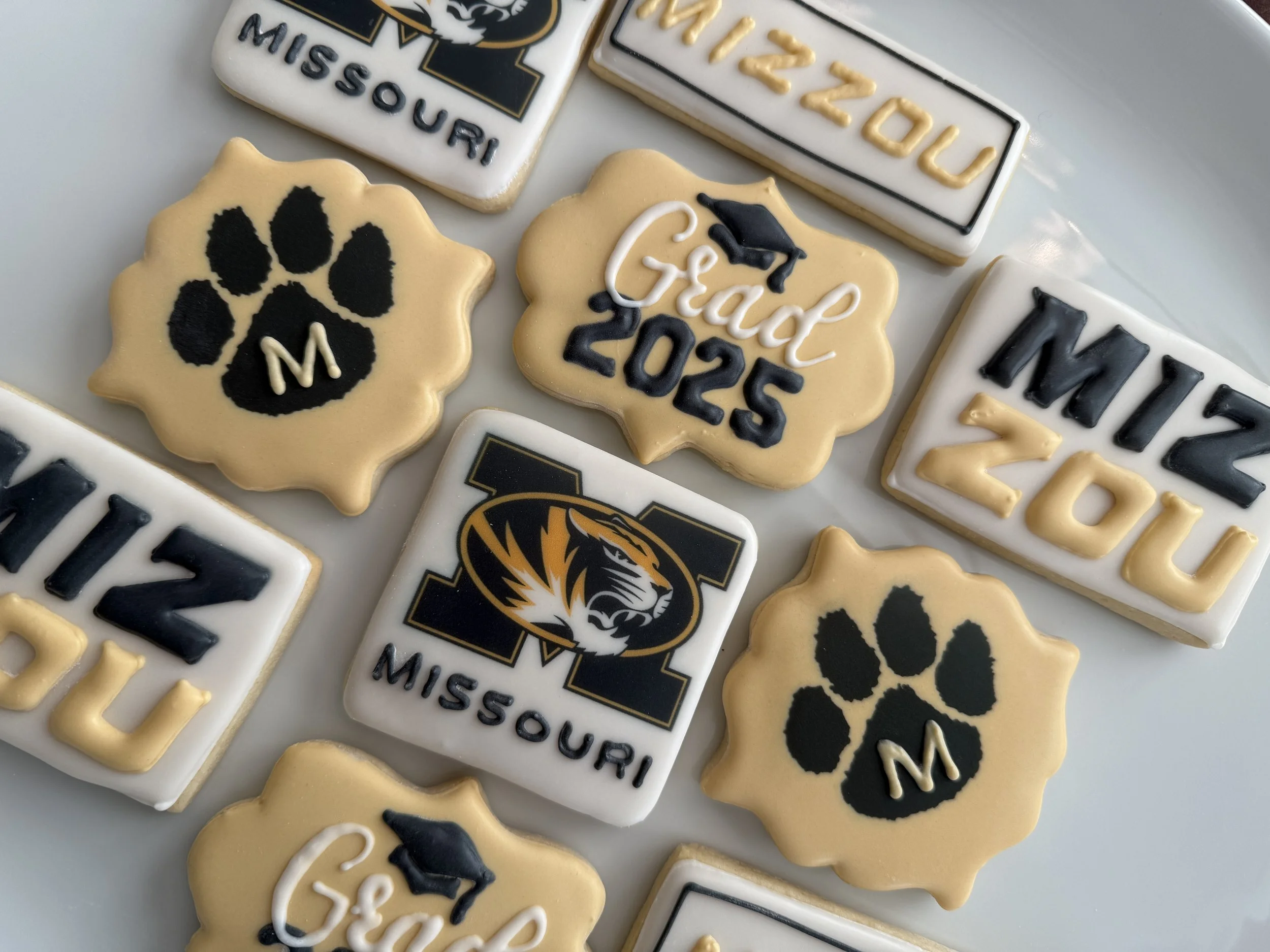 12 regular sized cookies with 4-6 different shapes with similar designs. Adding details, colors, metallics, lots of writing, complex designs, watercolor, edible images, etc. will all raise the price of the cookies.